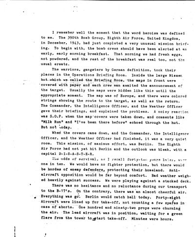 I remember well the moment that the word heroism was defined to me. The 390th Bomb Group, Eighth Air Force, United Kingdom, in December 1943, had just completed a very unusual mission briefing. To begin with, the bomb crews should have been alerted at an early morning breakfast. That morning we had fresh eggs, not powdered, and the rest of the breakfast was real too, not the usual ersatz.